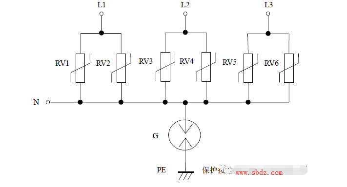 ①優(yōu)點:采用“3+1”電路,電路簡單,三相全保護。缺點:壓敏電阻短路失效后易引起火災。最好在每個壓敏電阻上串聯(lián)一個工頻保險絲以防壓敏電阻短路起火。