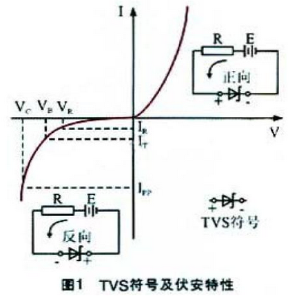 TVS是普遍使用的一種新型高效電路保護器件,它具有極快的響應(yīng)時間(亞納秒級)和相當高的浪涌吸收能力。當它的兩端經(jīng)受瞬間的高能量沖擊時,TVS能以極高的速度把兩端間的阻抗值由高阻抗變?yōu)榈妥杩?,以吸收一個瞬間大電流,從而把它的兩端電壓箝制在一個預(yù)定的數(shù)值上,從而保護后面的電路元件不受瞬態(tài)高壓尖峰脈沖的沖擊。正因為如此,TVS 可用于保護設(shè)備或電路免受靜電、電感性負載切換時產(chǎn)生的瞬變電壓[4],以及感應(yīng)雷所產(chǎn)生的過電壓。圖1所示為TVS 的符號及伏安特性曲線。