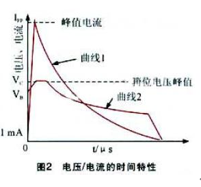 圖2 是在雙蹤示波器上觀察到的TVS 管在承受大電流沖擊時的電流及電壓波形。圖中,曲線1 是TVS 管中的電流波形,可以看出:其流過TVS 管的電流由1mA 突然上升到峰值后,然后按指數(shù)規(guī)律下降。曲線2 是TVS 管兩端的電壓波形,它表示TVS 中的電流突然上升時,TVS 兩端電壓也隨之上升。在浪涌電壓的作用下,TVS 兩極間的電壓由額定反向關(guān)斷電壓VRWM 上升到擊穿電壓VB 而被擊穿。隨著擊穿電流的出現(xiàn),流過TVS 的電流將達到峰值脈沖電流IPP,同時其兩端的電壓被箝位到預(yù)定的最大箝位電壓VC 以下。其后,隨著脈沖電流按指數(shù)衰減,該過程中,TVS 兩極間的電壓也不斷下降,最后恢復(fù)到初態(tài),這就是TVS 抑制可能出現(xiàn)的浪涌脈沖功率,保護電子元器件的過程。事實上,當TVS 兩極受到反向高能量沖擊時,它能以10-12s 級的速度,將其兩極間的阻抗由高變低,以吸收高達數(shù)千瓦的浪涌功率,使兩極間的電位箝位于預(yù)定值,從而有效地保護電子設(shè)備中的元器件免受ESD 的損害。
