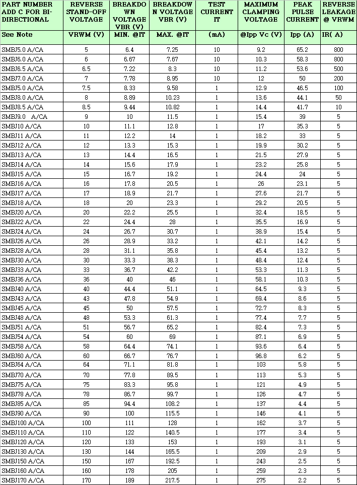 TVS 管和穩(wěn)壓管一樣,也是反向應(yīng)用的。其中VR 稱為最大轉(zhuǎn)折電壓,是反向擊穿之前的臨界電壓。VB 是擊穿電壓,其對(duì)應(yīng)的反向電流IT 一般取值為1 mA。VC 是最大箝位電壓,當(dāng)TVS 管中流過(guò)的峰值電流為IPP 的大電流時(shí),管子兩端電壓就不再上升了。因此TVS 管能夠始終把被保護(hù)的器件或設(shè)備的端口電壓限制在VB~VC 的有效區(qū)內(nèi)。與穩(wěn)壓管不同的是,IPP 的數(shù)值可達(dá)數(shù)百安培,而箝位響應(yīng)時(shí)間僅為1×10-12s。TVS 的最大允許脈沖功率為PM=VCIPP,且在給定最大鉗位電壓下,功耗PM 越大,其浪涌電流的承受能力越大。