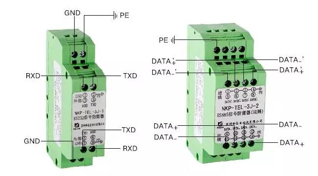 數(shù)字信號(hào)防雷器用于RS232、RS485、RS422等數(shù)字通信端口的防雷,采用標(biāo)準(zhǔn)插口和端子接線形式,可串接在通信設(shè)備輸入端,防雷器的外部信號(hào)端接輸入線,輸出端接保護(hù)設(shè)備,PE端應(yīng)于大地引線可靠連接。