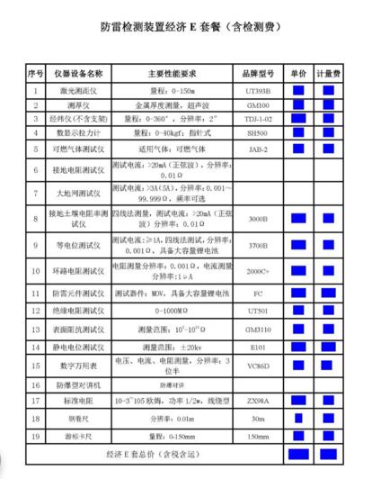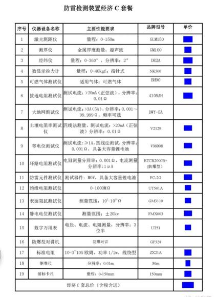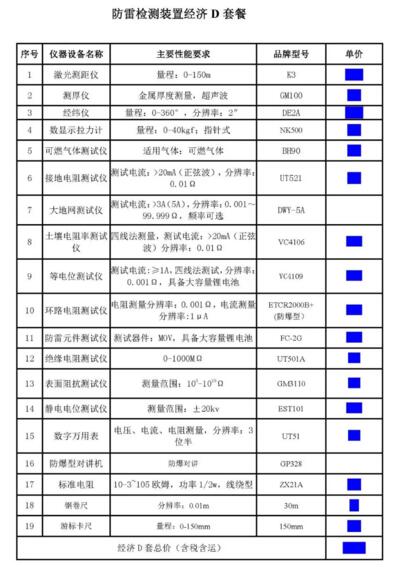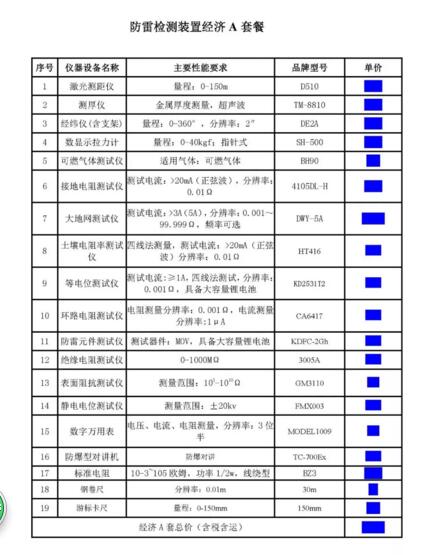 為方便申請(qǐng)檢測(cè)資質(zhì)單位對(duì)設(shè)備的選購(gòu)需求,我們依據(jù)《雷電防護(hù)裝置檢測(cè)資質(zhì)管理辦法》中附表1《防雷裝置檢測(cè)專業(yè)設(shè)備表》的要求提供了防雷檢測(cè)裝置經(jīng)濟(jì)A套餐、防雷檢測(cè)裝置經(jīng)濟(jì)B套餐、防雷檢測(cè)裝置經(jīng)濟(jì)C套餐、防雷檢測(cè)裝置經(jīng)濟(jì)D套餐、防雷檢測(cè)裝置經(jīng)濟(jì)E套餐(含檢測(cè)費(fèi))等,每個(gè)套餐內(nèi)設(shè)備可自由選(補(bǔ))配。