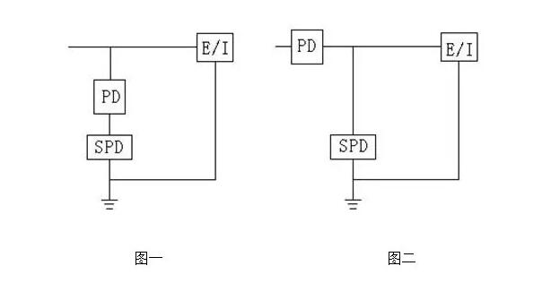 PD為電涌保護(hù)器的過流保護(hù)裝置;避雷器為電涌保護(hù)器;E/I為被電涌保護(hù)器保護(hù)的電氣裝置或設(shè)備。