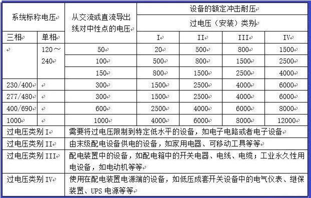 低壓配電網(wǎng)可能遭受的電涌能量形式及數(shù)值大小;電氣設(shè)備承受電涌沖擊的能力;如何實現(xiàn)讓電涌能量降低到電氣設(shè)備能夠承受的范圍之內(nèi)。低壓配電系統(tǒng)的保護對象是低壓配電網(wǎng)中的各類配電設(shè)備和用電設(shè)備。按照國家標(biāo)準(zhǔn)GB/T16935.1-2008《低壓系統(tǒng)內(nèi)設(shè)備的絕緣配合》,低壓配電系統(tǒng)各類設(shè)備的額定沖擊電壓耐受值見下表:
