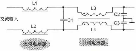 如上圖所示是共模和差模電感器電路,這也是開關(guān)電源交流市電輸入回路中的EMI濾波器,電路中的L1、L2是差模電感器,L3和L4為共模電感器,C1為×電容,C2和C3為Y電容,該電路輸入220V交流市電,輸出加到整流電中。