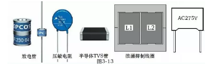 、氧化鋅壓敏電阻、半導體閘流管(TVS)、浪涌抑制電感線圈、X類浪涌抑制電容等,各種器件要組合使用。